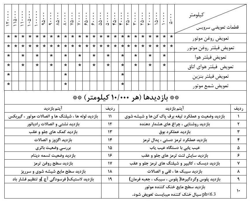 پژو 301 : هر 10.000 کیلومتر یا 12 ماه (هرکدام زودتر فرا برسد) با توجه به استفاده از موتور تنفس طبیعی